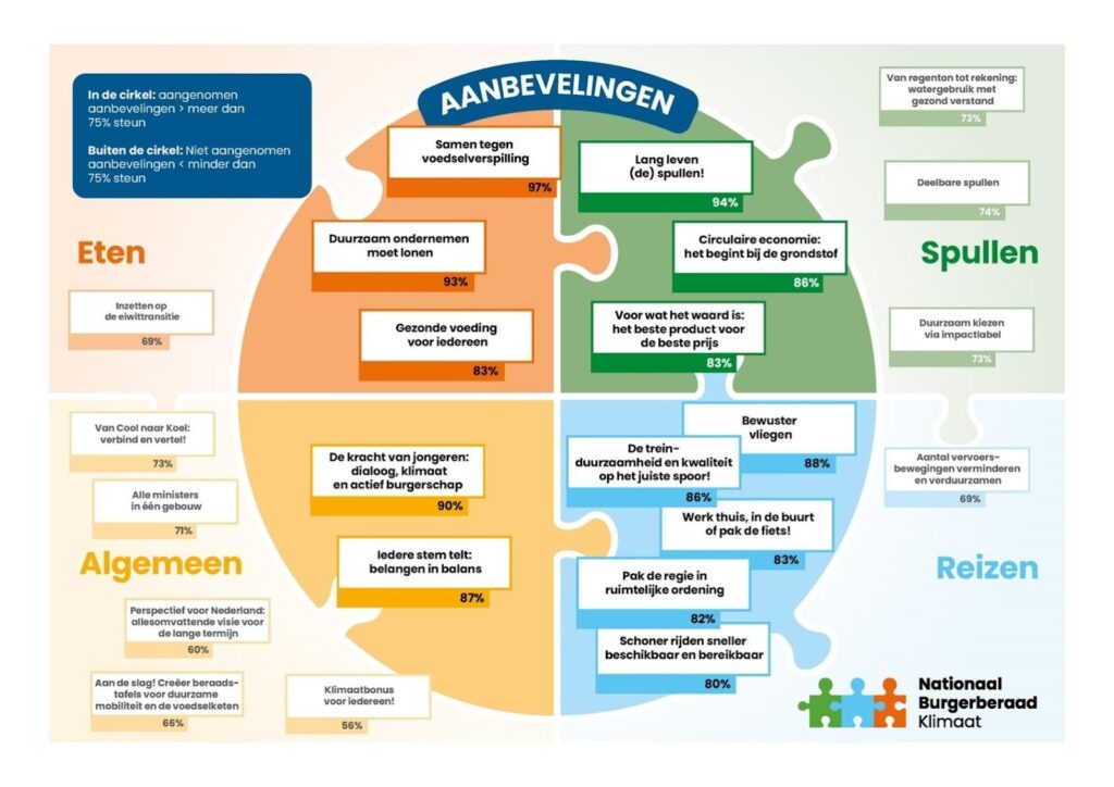 En bovendien kwamen ze met een rits aan zinvolle voorstellen aan het kabinet. Van belasting op kerosine tot een pleidooi voor het lonend maken van duurzaam ondernemen; van het streven naar een duurzame economie, tot het goedkoper maken van gezonde voeding. Hieronder staat het in de infographic in een notendopje. Bekijk het maar eens rustig.